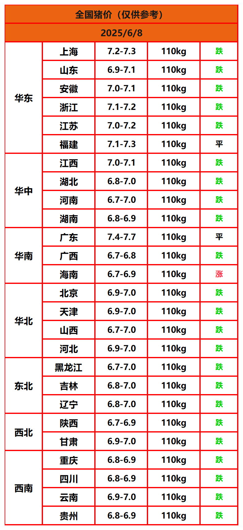 2025年6月8日猪价,今日全国猪价行情走势:1涨2平23跌。